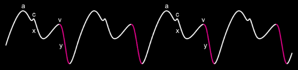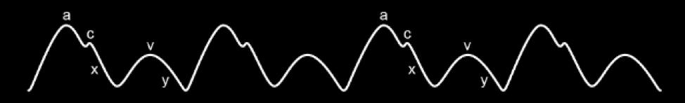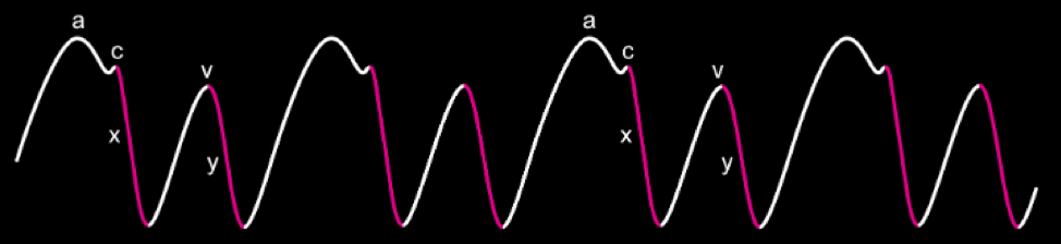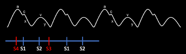 To be able to perform a qualitative assessment of the jugular venous pulse, one must be able to understand the normal waveform, and the cardiac events that cause each of its components to occur. It is helpful to orient yourself to the cardiac cycle.