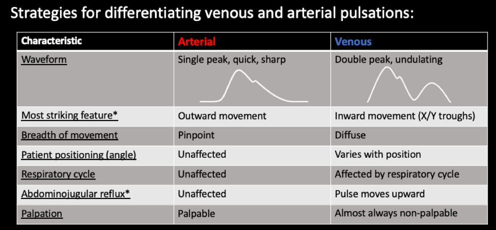 There are a host of strategies for determining whether the movement you are seeing is venous or arterial. The waveform itself can be revealing. An arterial pulse has a single peak that is quick and sharp. In contrast, the venous pulse is typically double and undulating in nature. The most striking feature of the arterial pulse is the outward movement. Obviously, what goes out must come back in, but it does so subtly and gradually and it is hardly noticeable. The most striking feature of the venous pulse on the other hand is the inward movement (the x and y troughs). The arterial pulse tends to be pinpoint, involving a small area of the neck. The venous pulse on the other hand is diffuse, often involving a large area of the neck. The arterial pulse does not vary with patient positioning, respiratory cycle, or abdominal pressure. In contrast, the venous pulse is affected by all three actions. As the angle at which the patient is positioned decreases, the venous pulse climbs up the neck, and as the angle is increased, the venous pulse moves downward. The venous pulse is also affected by respiration, normally moving down with inspiration. And with abdominal pressure, the venous pulse will move up the neck. Finally, the arterial pulse is palpable while the venous pulse is almost always non-palpable.