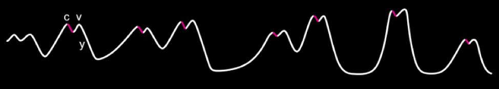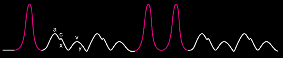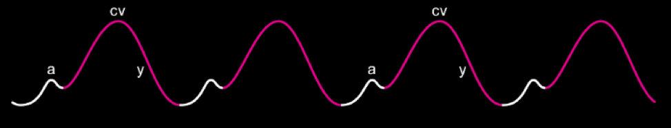 Let us start with the first peak in the waveform, the a wave, which is caused by right atrial contraction. When the atrium contracts, pressure inside the atrium increases, and this is seen as a positive deflection in the jugular venous waveform. Atrial contraction occurs at the very end of diastole, when the atrium is squeezing the last bit of blood into the right ventricle. Next, during early systole, isovolumetric ventricular contraction triggers closure of the tricuspid valve, which bulges into the right atrium, producing the c wave. In mid-systole, the combination of atrial relaxation and descent of the atrial floor during ventricular contraction results in the x descent. The third peak, the v wave, occurs as a result of atrial filling during late systole. Finally, passive ventricular filling in early diastole produces the y descent.