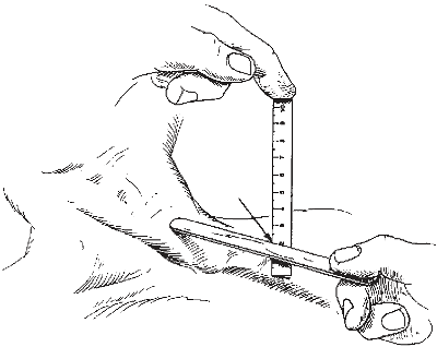 We do not know of any clinicians who actually use this technique at the bedside. Instead, measure the width of your hand. This can be used as the vertical rule straight edge, and you can estimate JVP that way.