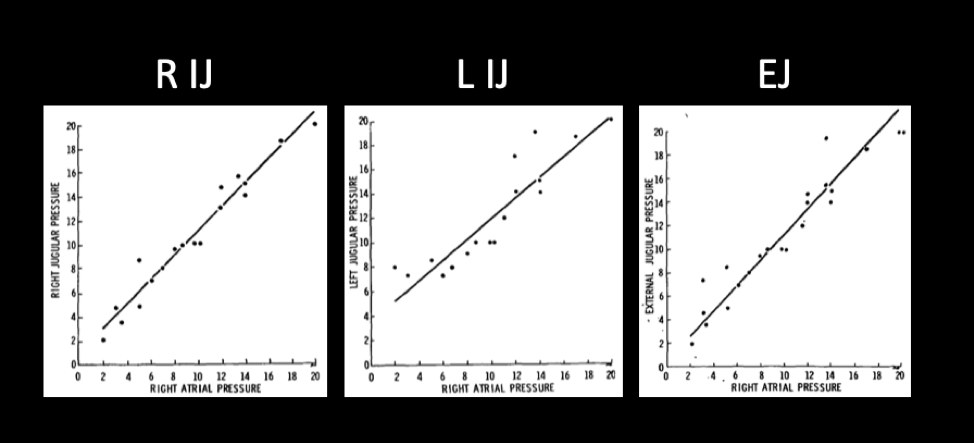 This data is from a 1973 study and it demonstrates two things. First, the RIJ is highly reliable for estimating central venous pressure. Second, the LIJ and EJ are nearly as reliable as the RIJ. Right atrial pressure is plotted on the X axis, and the pressure of the blood vessel in question on the Y axis. All measurements were obtained directly. You can see that for the most part, there is a linear relationship between the pressure in the right atrium and the pressure in each of those blood vessels. It should be noted that while the EJ can be used to estimate CVP, it does not transmit the actual waveform very well, so it is less reliable for the purposes of qualitative assessment.
