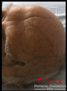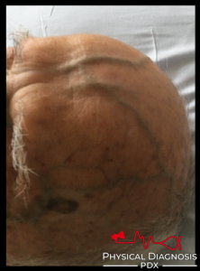 When you see abnormal indentations in a patient’s forehead, you should immediately consider longstanding elevated central venous pressure. Here is a photograph of a patient with such indentations: