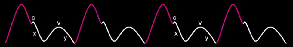 Here we have sharp x and y descents, known as the “W” sign. In a subset of patients with constrictive pericarditis, the prominent y descent occurs in combination with a prominent x descent, creating two steep troughs known as the “W” sign. This sign is more specific for constrictive pericarditis than Friedreich’s sign, and can therefore be helpful in distinguishing constrictive pericarditis from restrictive cardiomyopathy. As before, listen for an associated pericardial knock.