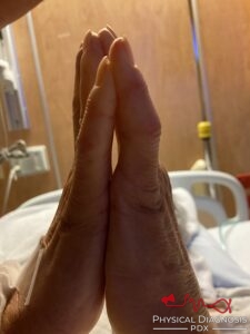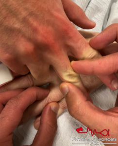 (Examiner’s hand is shown above, patient’s below.)