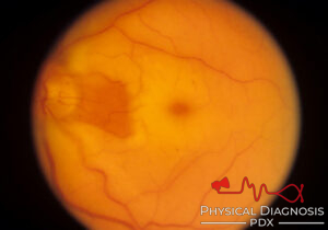 This patient has Central Retinal Artery Occlusion. In this image, cherry red spot, and ciliary retinal artery sparing (small intact area of perfusion) are also visible.