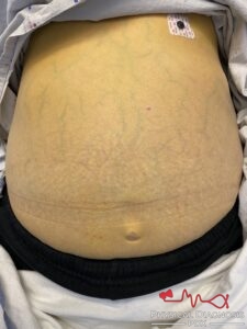 Distended and engorged superficial epigastric veins, which are seen radiating from the umbilicus across the abdomen. The name caput medusae (Latin for “head of Medusa”) originates from the apparent similarity to Medusa’s head, which had venomous snakes in place of hair.