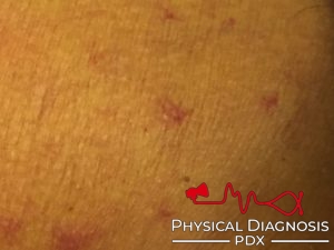 A form of telangiectasias where a central arteriole feeds telangiectasias, and is seen in conditions of estrogen excess, such as pregnancy and liver disease. In liver disease, the spiders are most often seen in the face and chest areas (drained by the SVC), and is more commonly seen in alcoholic liver disease compared to other etiologies.