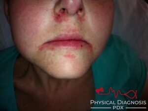 Scaling and erythema of the oral commissures, associated with a number of nutritional deficiencies.