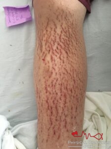 This patient has eczema craquele. Note the red lesions (fissures) that resemble a dried river bed which is a key finding.