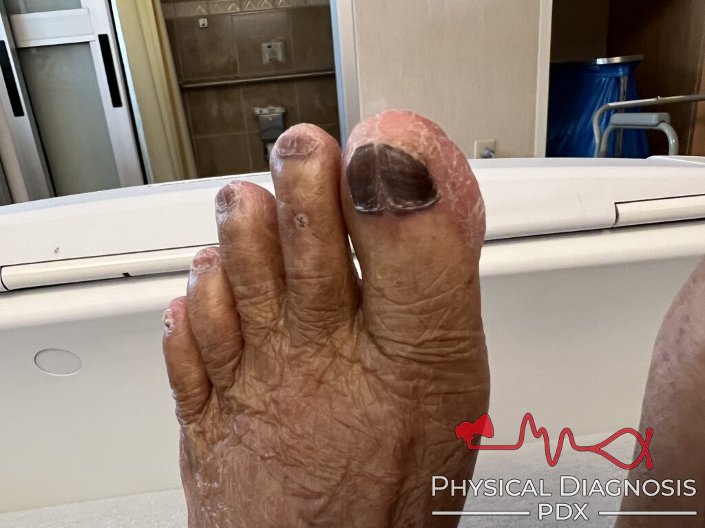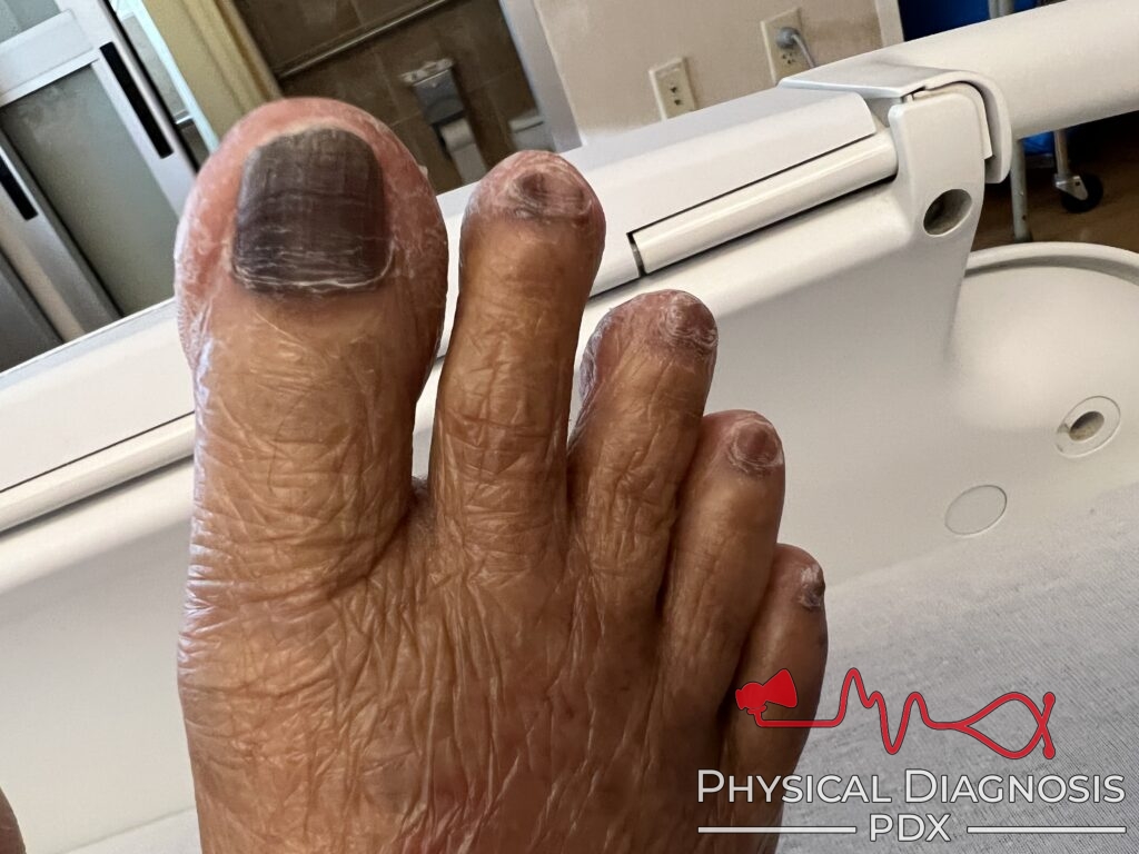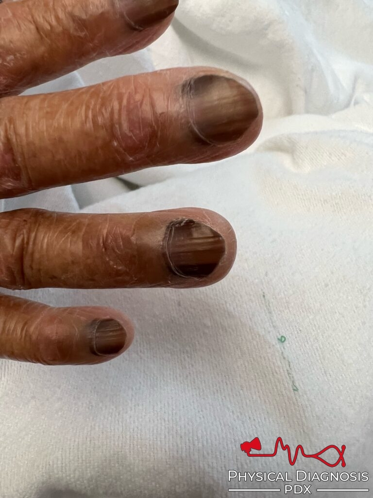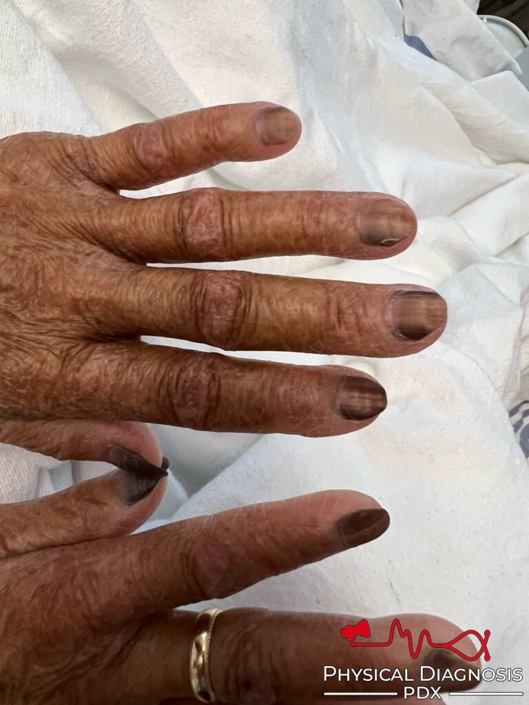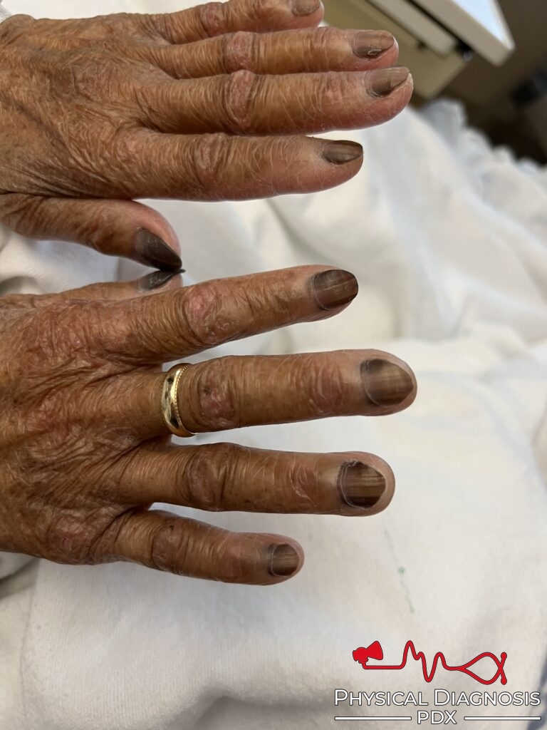This is an older woman with jak2 v617f-positive essential thrombocythemia, who was recently started on hydroxyurea; after a few weeks of treatment she developed darkening of the nails on her hands and feet.