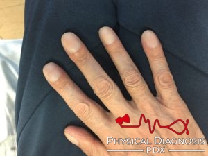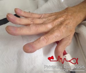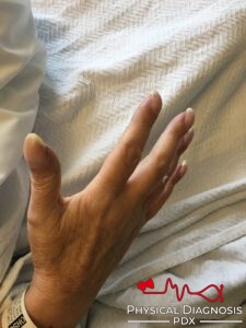 This is a middle-aged woman with cirrhosis who was found to have digital clubbing, likely caused by hepatopulmonary syndrome.