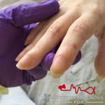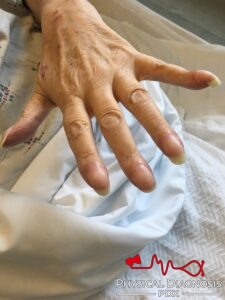 This is a middle-aged woman with cirrhosis who was found to have digital clubbing, likely caused by hepatopulmonary syndrome. Also note the palmar erythema.