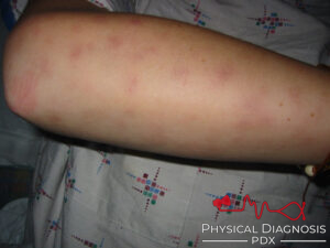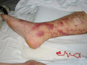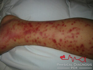 This is a young man who presents with rash on his legs and scrotum with a year of recurrent “non-Strep strep throat”.