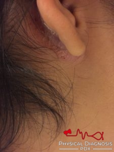 This is a previously healthy young woman who presented with subacute atraumatic pain and swelling of her right knee and left foot. The right knee was erythematous and warm with an associated joint effusion that contained 15K WBC/μL but no organisms or crystals. She was taken for a washout of the knee for presumed septic arthritis. Later, physical examination revealed well-demarcated erythematous plaques involving the posterior neck and ear, as well as the oil drop sign on one of her fingernails, consistent with psoriatic arthritis.